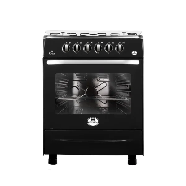 La cocina de 5 hornillas de la Línea Deluxe, tiene una encimera de acero inoxidable garantizando mayor resistencia y durabilidad, esta se enciende de forma eléctrica e independiente y sus quemadores tipo Sabaf son de alta resistencia, además su horno tiene una capacidad de 60 litros, su puerta es de doble vidrio templado transparente para mayor concentración de calor y mejor visualización.