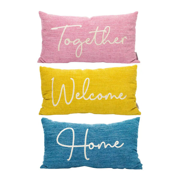 Es una almohada lumbar súper suave y afelpada con un patrón de espiga en beige, gris y blanco en un lado y una tela texturizada de color con texto en el otro lado.