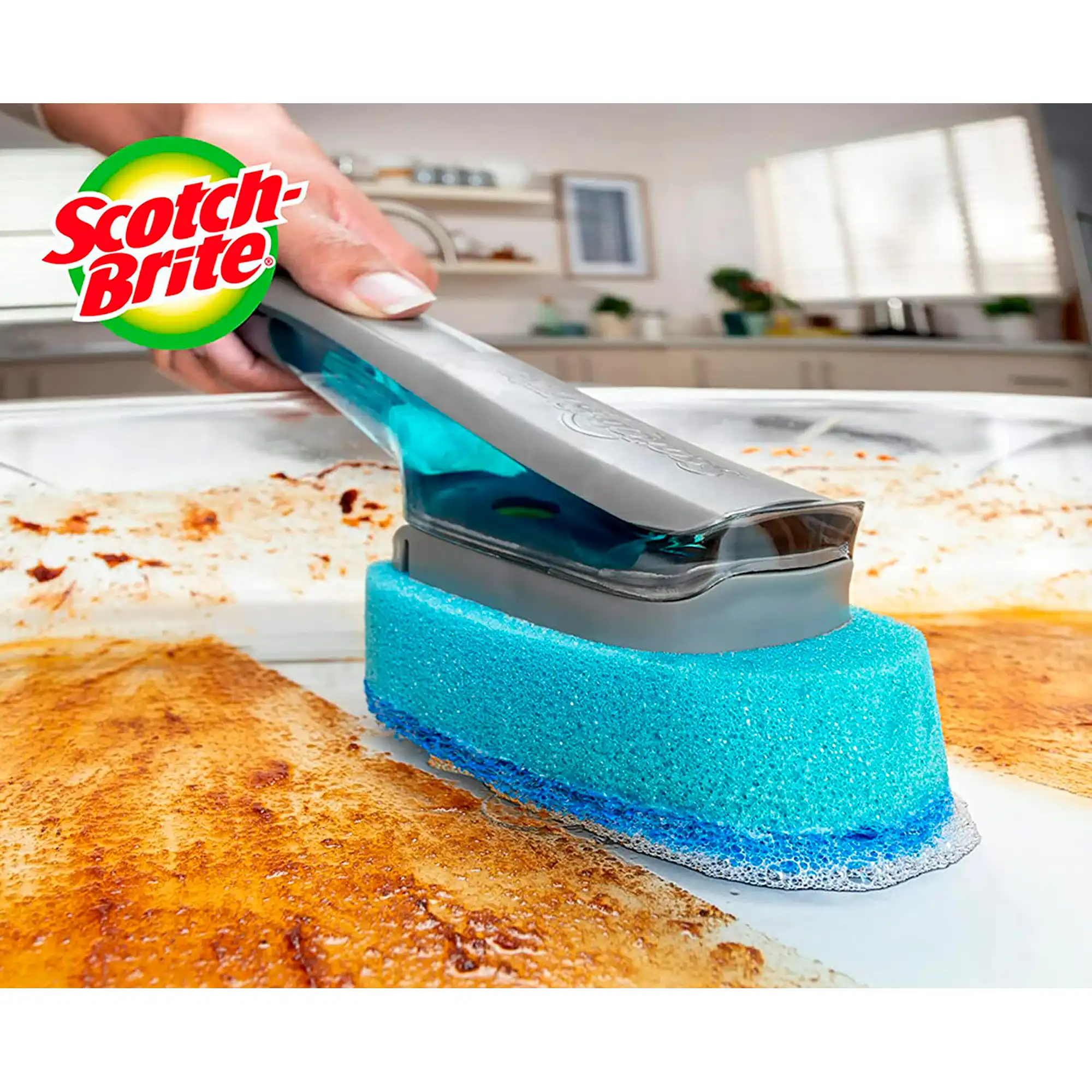 El lavaplatos con control de jabón Scotch-Brite mantiene sus manos fuera del desorden. La válvula evita que el jabón se escape, sin importar cómo se guarde el lavavajillas.