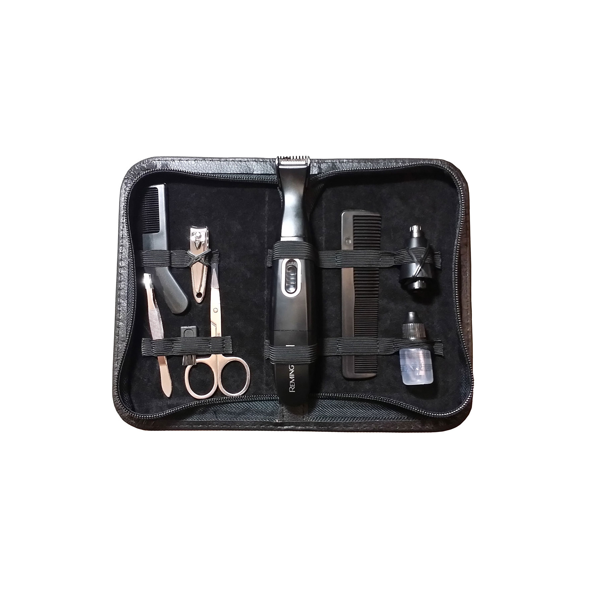 Incluye 12 piezas: Guía de Peine ajustable, Cortadora de barba, Recortadora de hoja, Detalladora para Nariz y oidos, Peine, Tijeras, Pinzas, Cortador de uñas, Aceite lubricante.