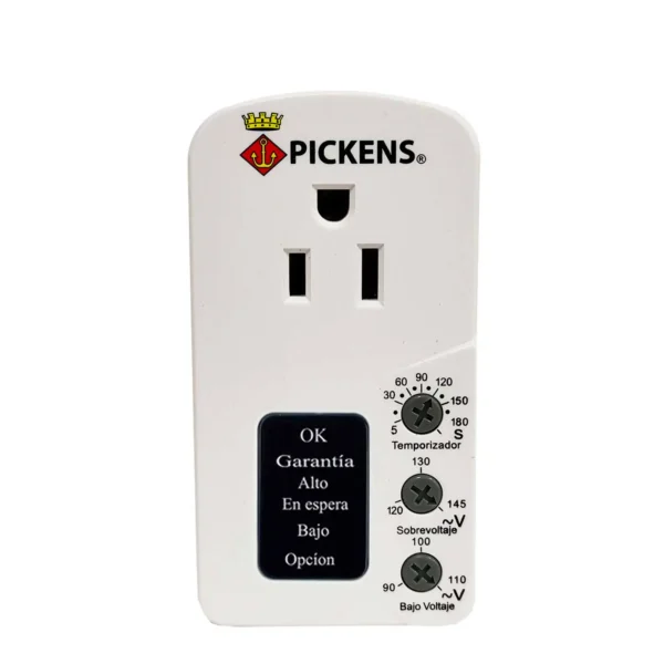 Protector de voltaje ajustable multipropósito 110V PICKENS, con selector de tiempo de espera según el dispositivo a utilizar.