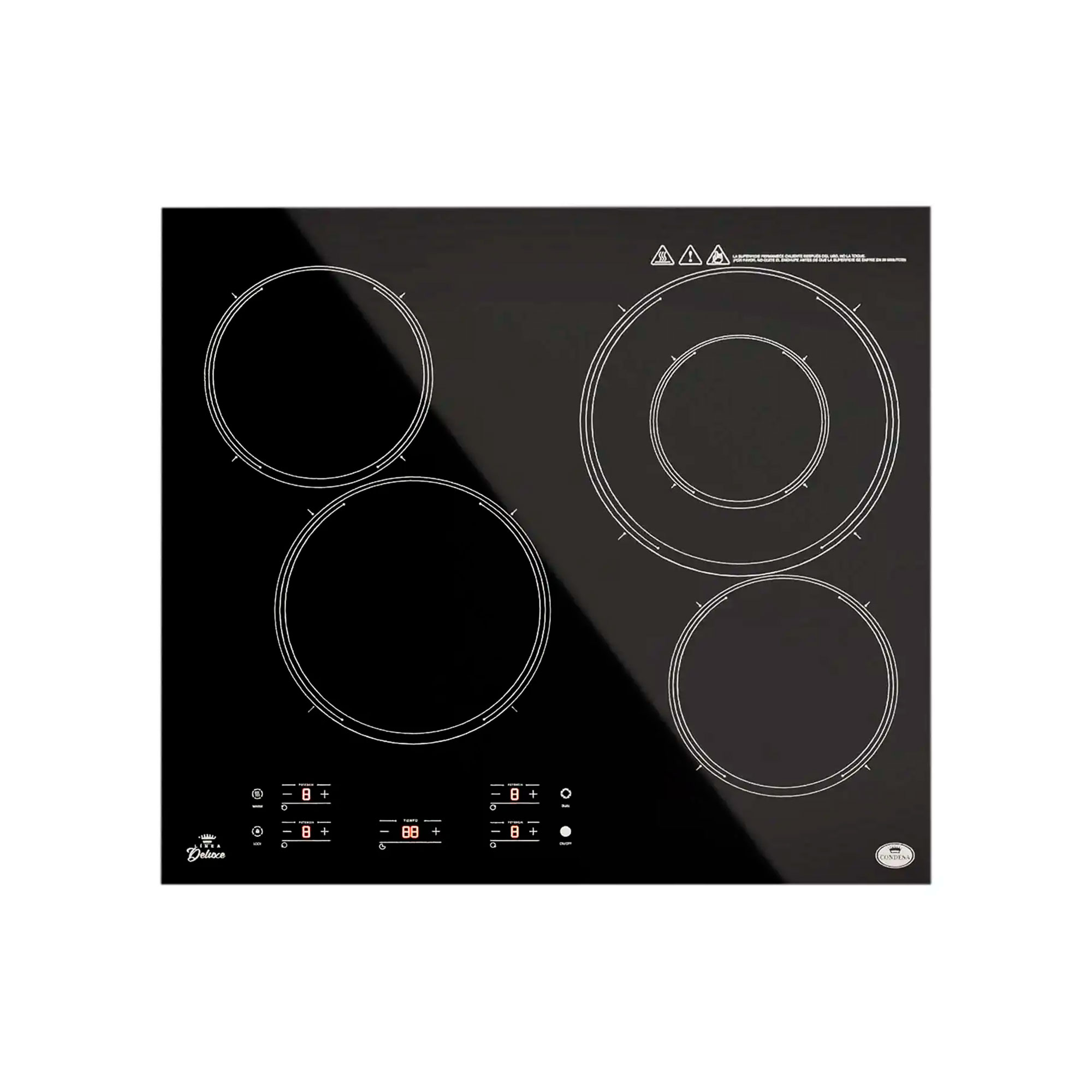 Condesa nos presenta este tope eléctrico de vitrocerámica de 4 hornillas de 60 cm, compatible con todo tipo de ollas.
